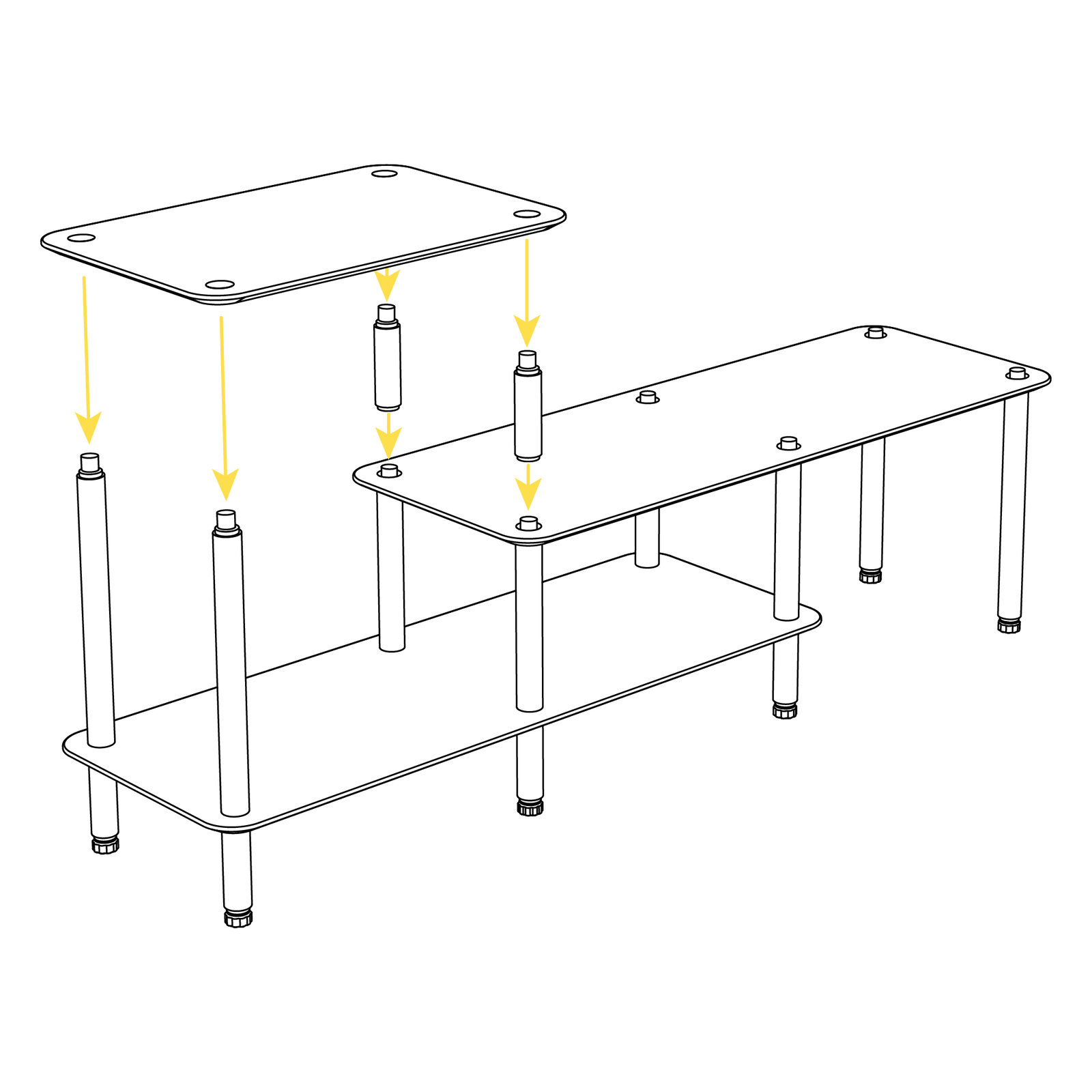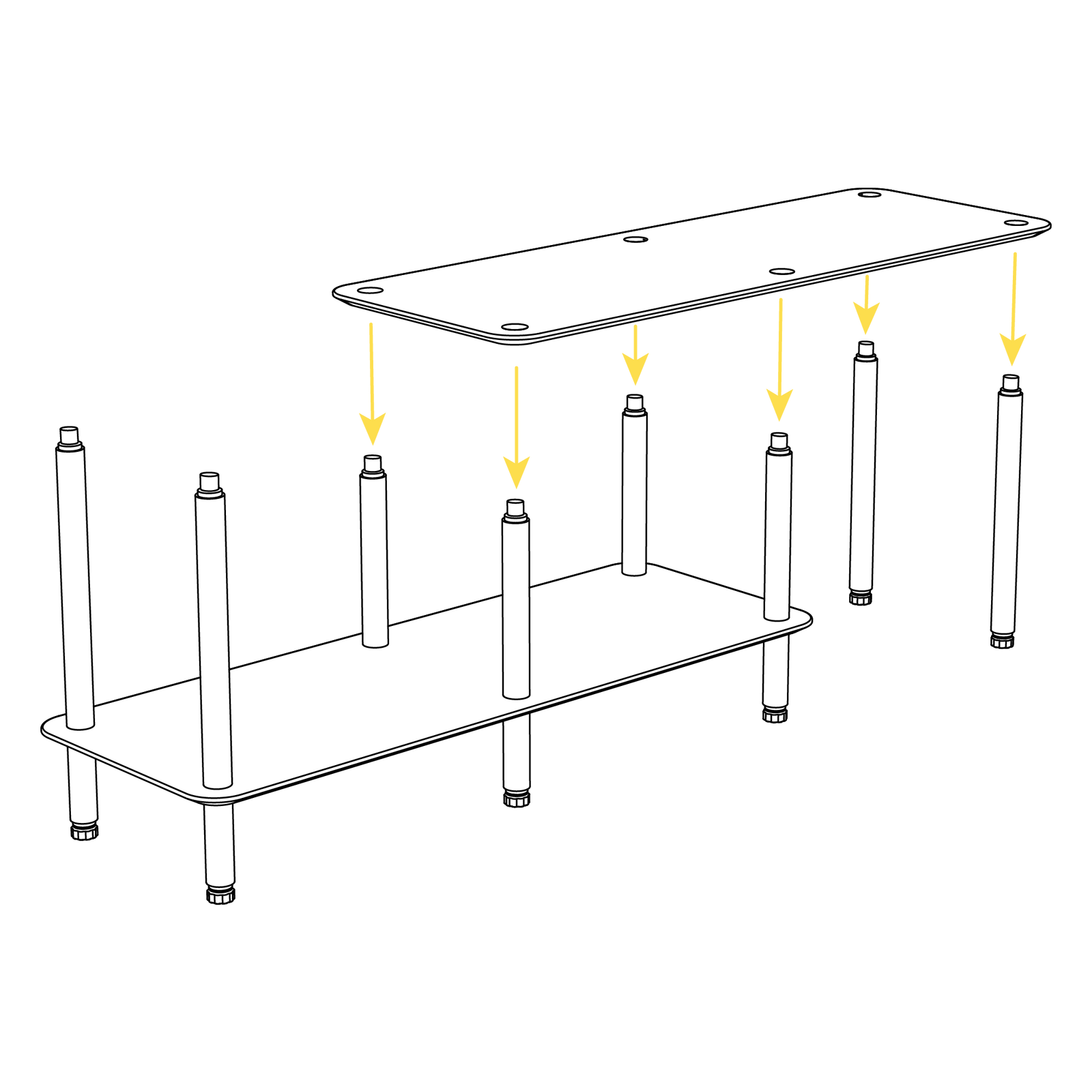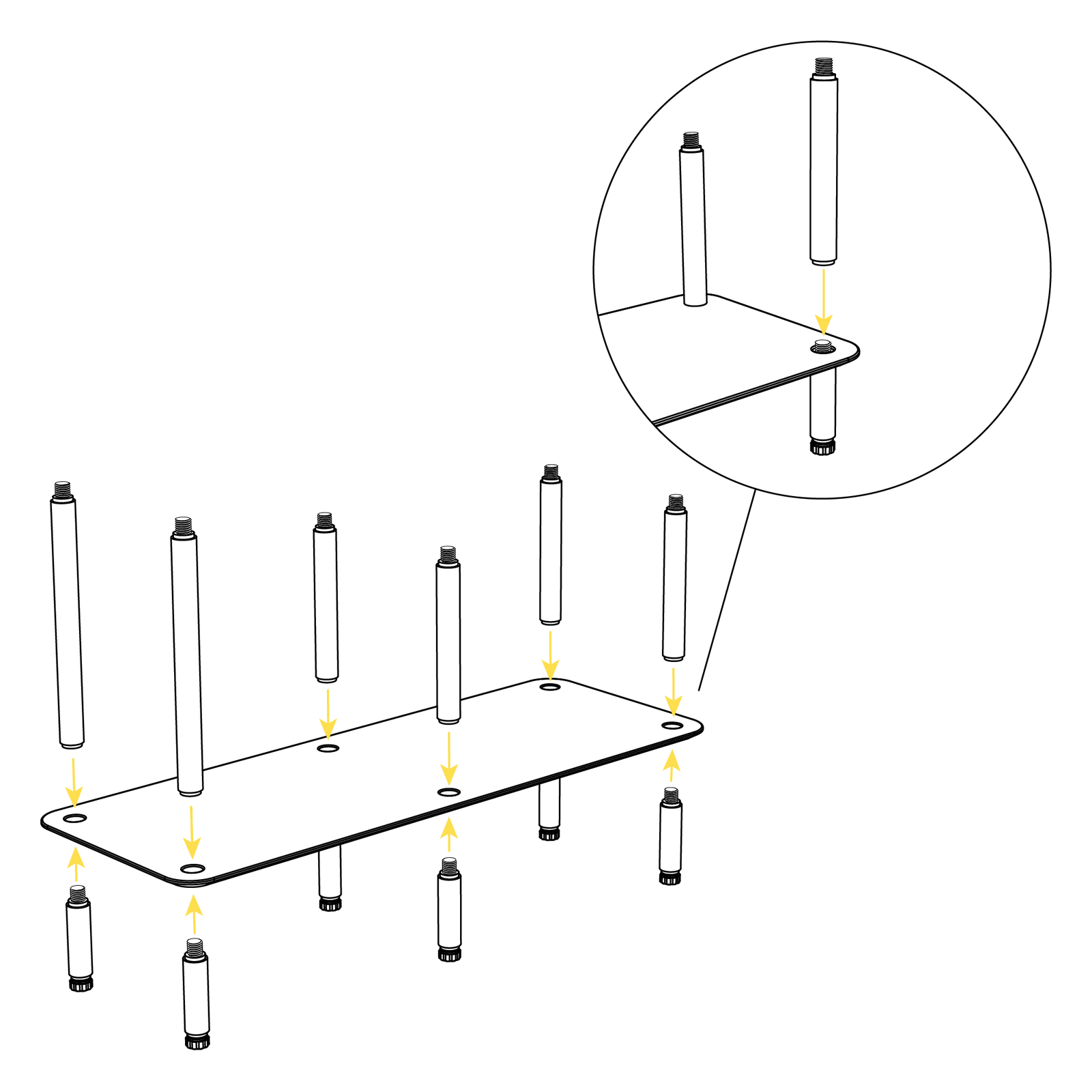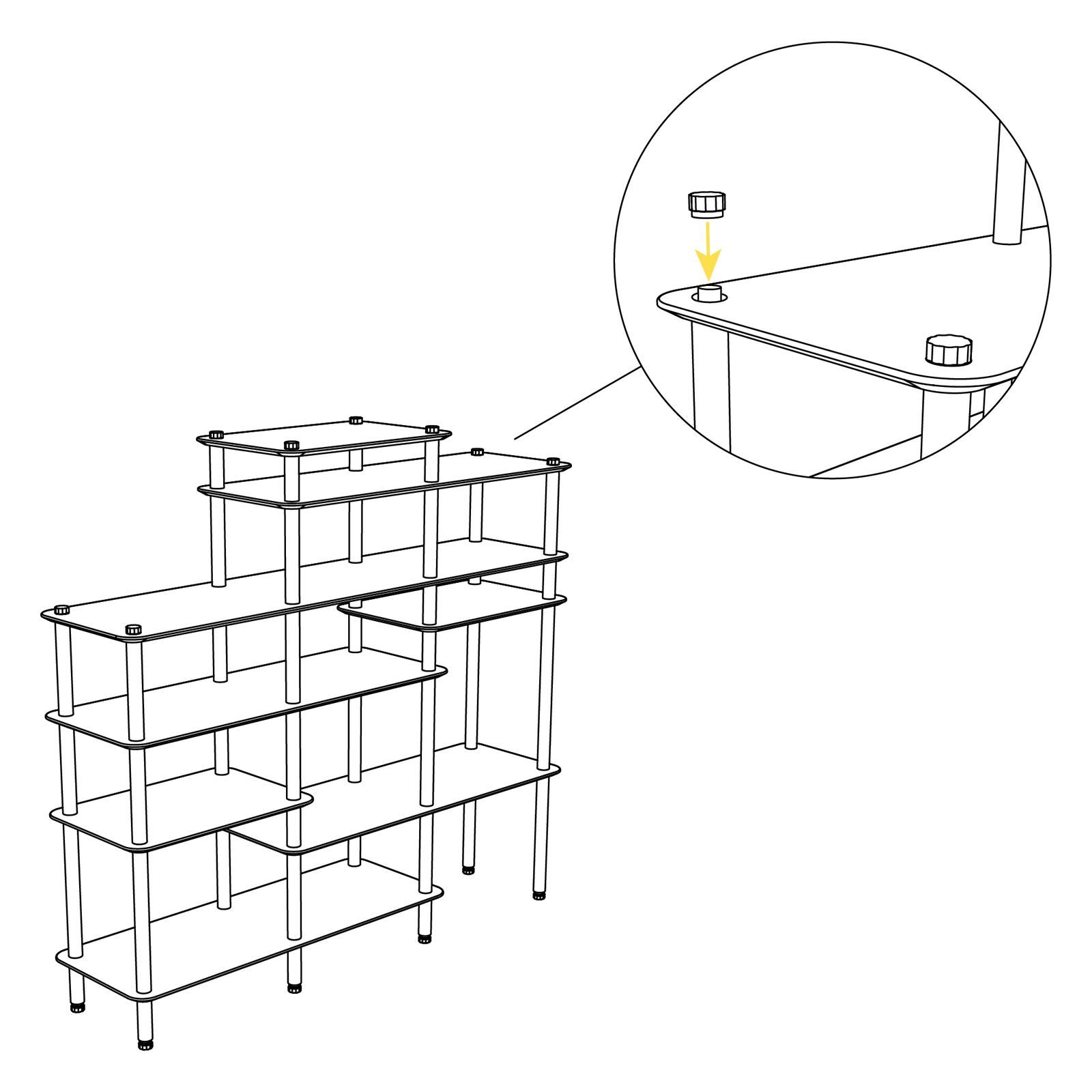 2. Place shelf inbetween adjustable feet and thread four medium and two large dowel lengths together to lock in the base shelf.